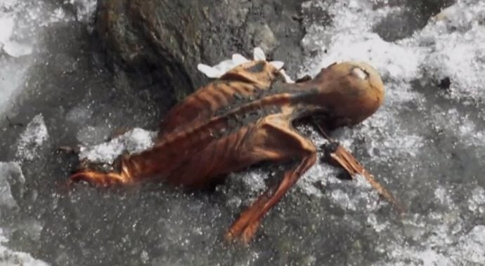 Dat zouden we op basis van de made in zijn maag inderdaad kunnen aannemen. Maar op de plek waar de IJsman in 1992 werd gevonden is ook een stukje verkoold steenbokbot aangetroffen, wat er op zou kunnen wijzen dat hij ter plekke vlees heeft bereid. Het is een beetje een raadsel: aan de ene kant hebben we een stukje verkoold steenbokbot gevonden, aan de andere kant we hebben geen concreet bewijs van een kampvuur aangetroffen. Bovendien had Ötzi geen werkende pijl en boog mee, dus als het vlees vers was, hoe is hij er dan aangekomen?